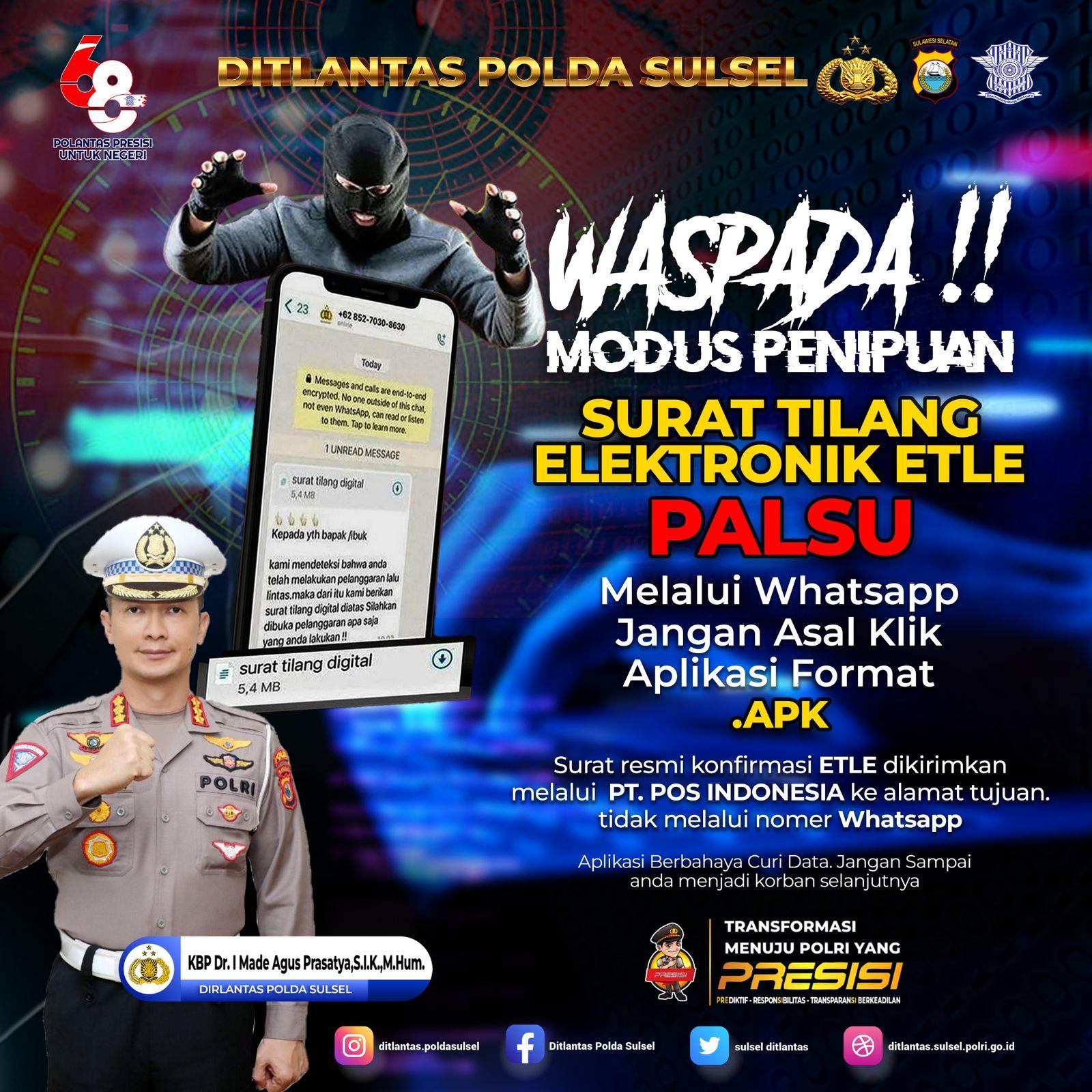 "Warga harus memantau berita maupun kabar yang valid, dan bahwa surat resmi konfirmasi ETLE ini, dikirimkan melalui PT Pos Indonesia ke alamat yang dituju, tidak melalui nomor WhatsApp (WA)," tutupnya.