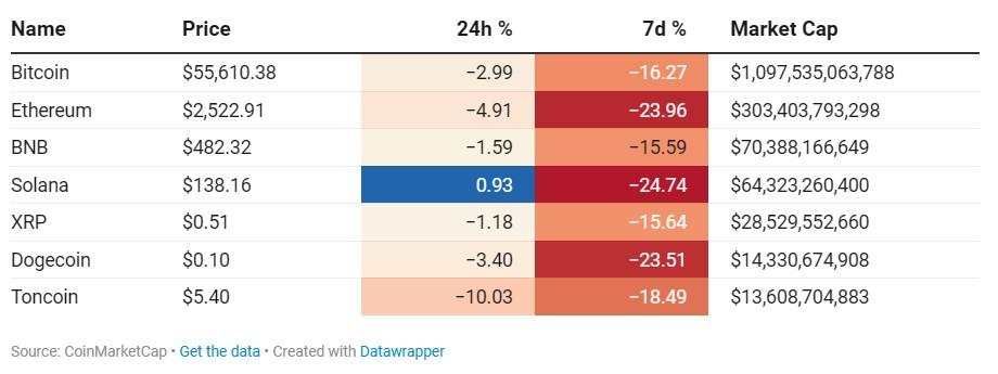 Berdasarkan data dari CoinMarketCap pada Selasa (6/8/2024) pukul 07:35 WIB, sebagian besar aset kripto mengalami penurunan. Bitcoin mengalami penurunan sebesar 2,99 persen menjadi US$55.610,38, dengan penurunan mingguan mencapai 16,27 persen.